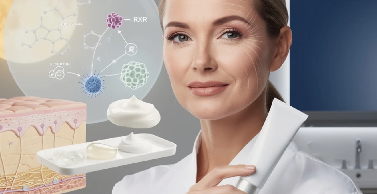 Au niveau cellulaire, la trétinoïne traverse la membrane plasmique des kératinocytes et des fibroblastes pour atteindre le noyau. Elle se lie ensuite à deux familles de récepteurs nucléaires : les RAR (Retinoic Acid Receptors) comprenant les sous-types alpha, bêta et gamma, ainsi que les RXR (Retinoid X Receptors). Cette liaison forme un complexe transcriptionnel qui se fixe sur des séquences spécifiques de l’ADN appelées RARE (Retinoic Acid Response Elements). Ce processus déclenche ou réprime l’expression de centaines de gènes impliqués dans la différenciation cellulaire, la prolifération et la production de protéines structurelles. Les récepteurs RAR-gamma sont particulièrement abondants dans l’épiderme, expliquant l’impact significatif de la trétinoïne sur le renouvellement cutané. Cette interaction moléculaire constitue le fondement scientifique de l’efficacité exceptionnelle de cet actif contre les signes visibles du vieillissement.